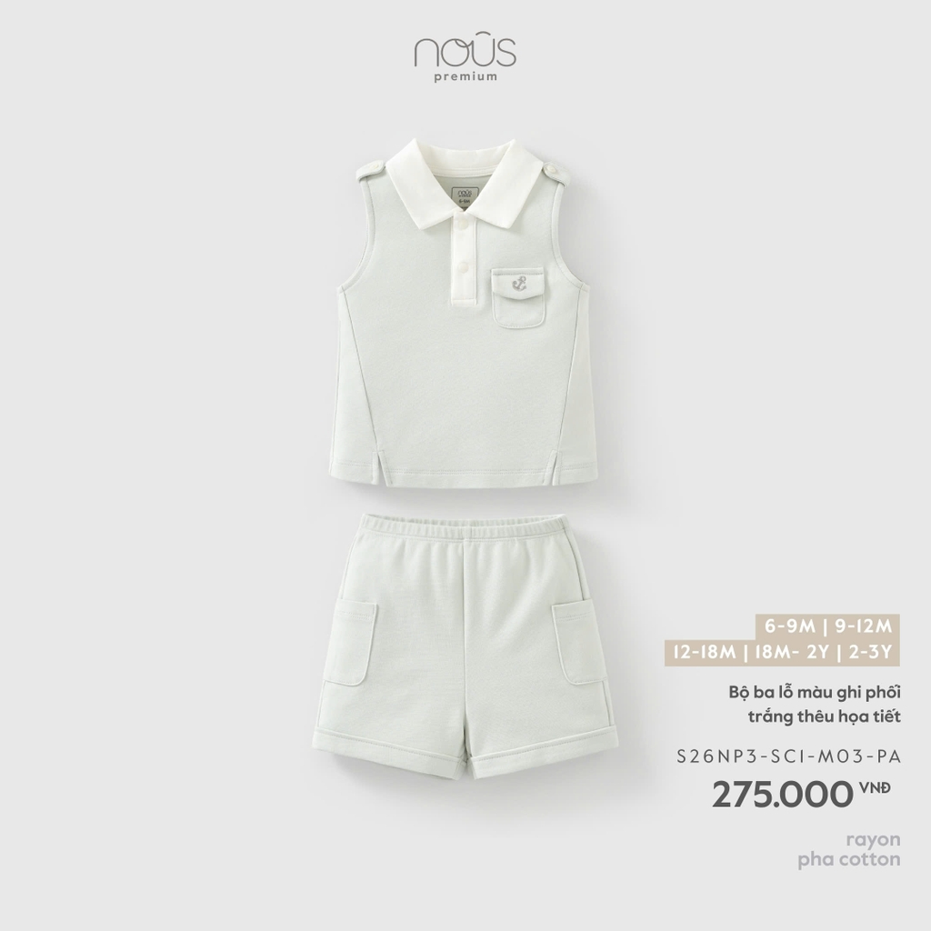NOUS - Bộ ba lỗ màu ghi phối trắng thêu họa tiết - 2-3Y - SS26.T4A
