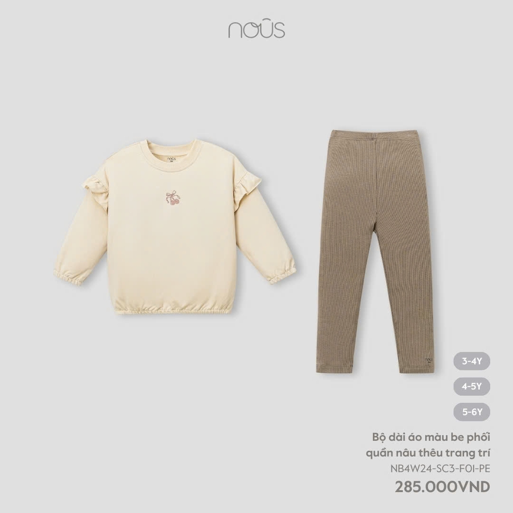 NOUS:-:Bộ:dài:áo:màu:be:phối:quần:nâu:thêu:trang:trí:-:5-6Y:-:SS24.T10A