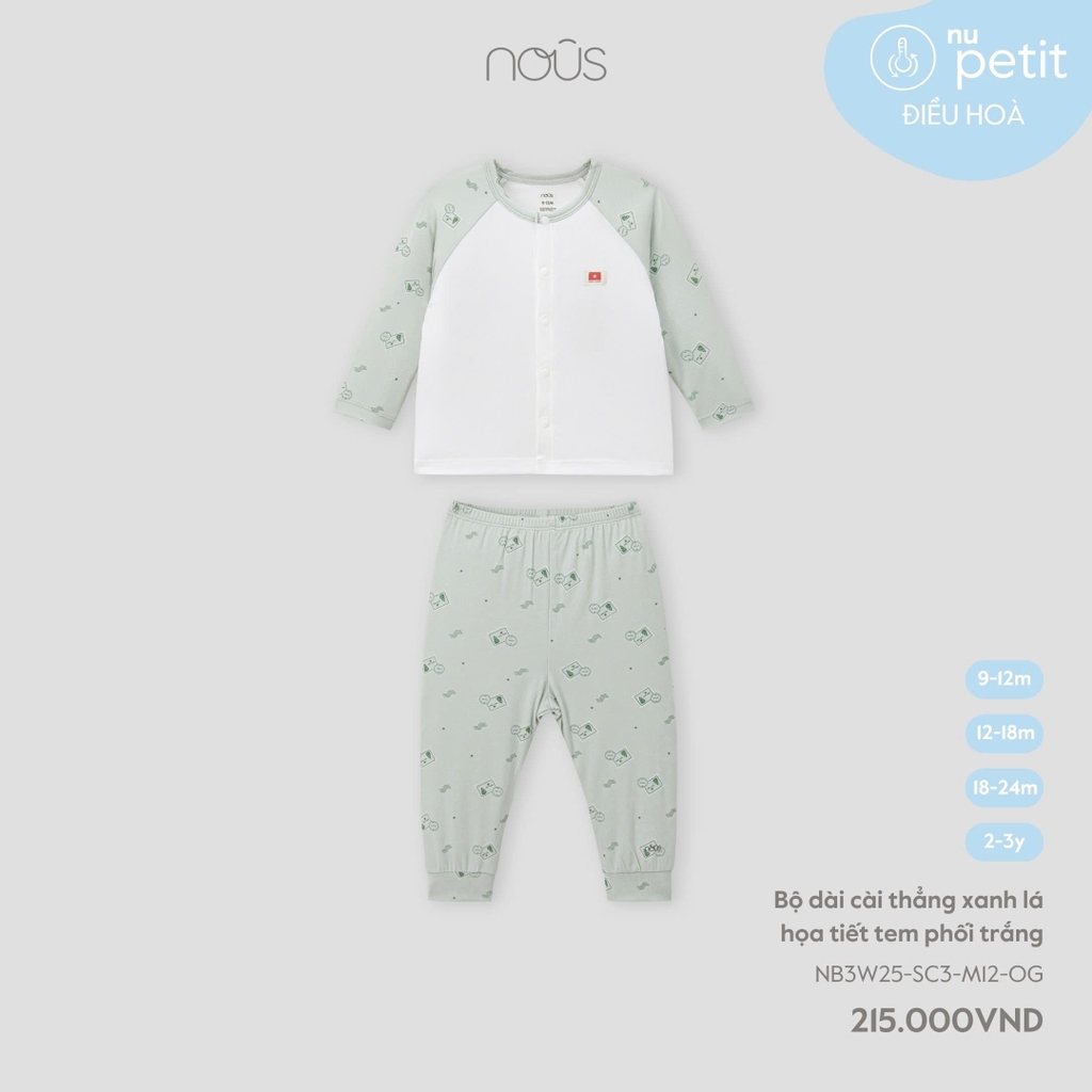 NOUS - Bộ dài cài thẳng xanh lá họa tiết tem phối trắng - SS25.T7A - tiết tem phối trắng - 2-3Y