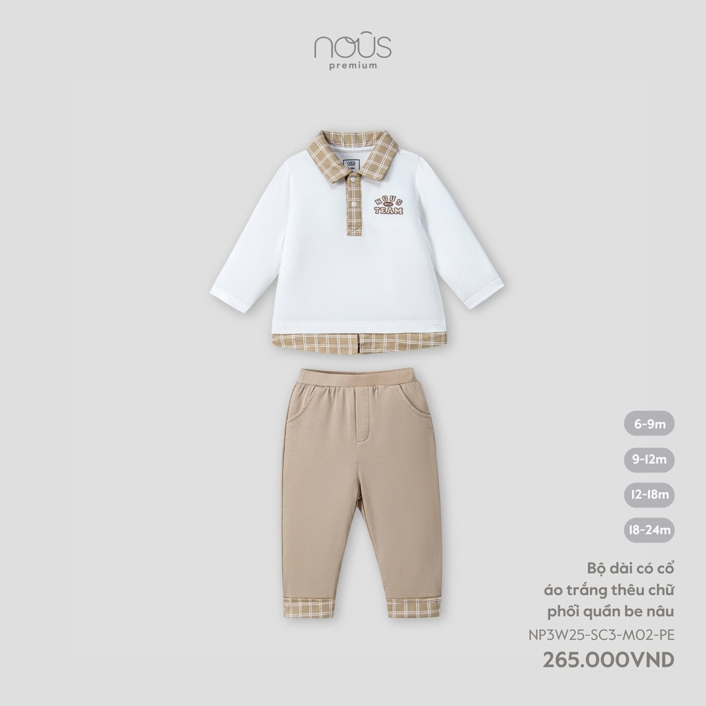 NOUS - Bộ dài có cổ áo trắng thêu chữ phối quần be nâu - 9-12M - SS25.T8A