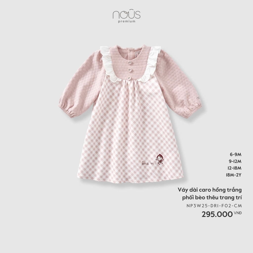 NOUS - Váy dài caro hồng trắng phối bèo thêu trang trí - - 9-12M - SS25.T11A